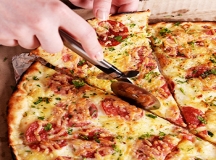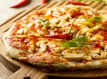 Served on a Thin Crust with Feta Cheese, Bacon Bits, Grilled Chicken, and Chopped Onion and Tomatoes